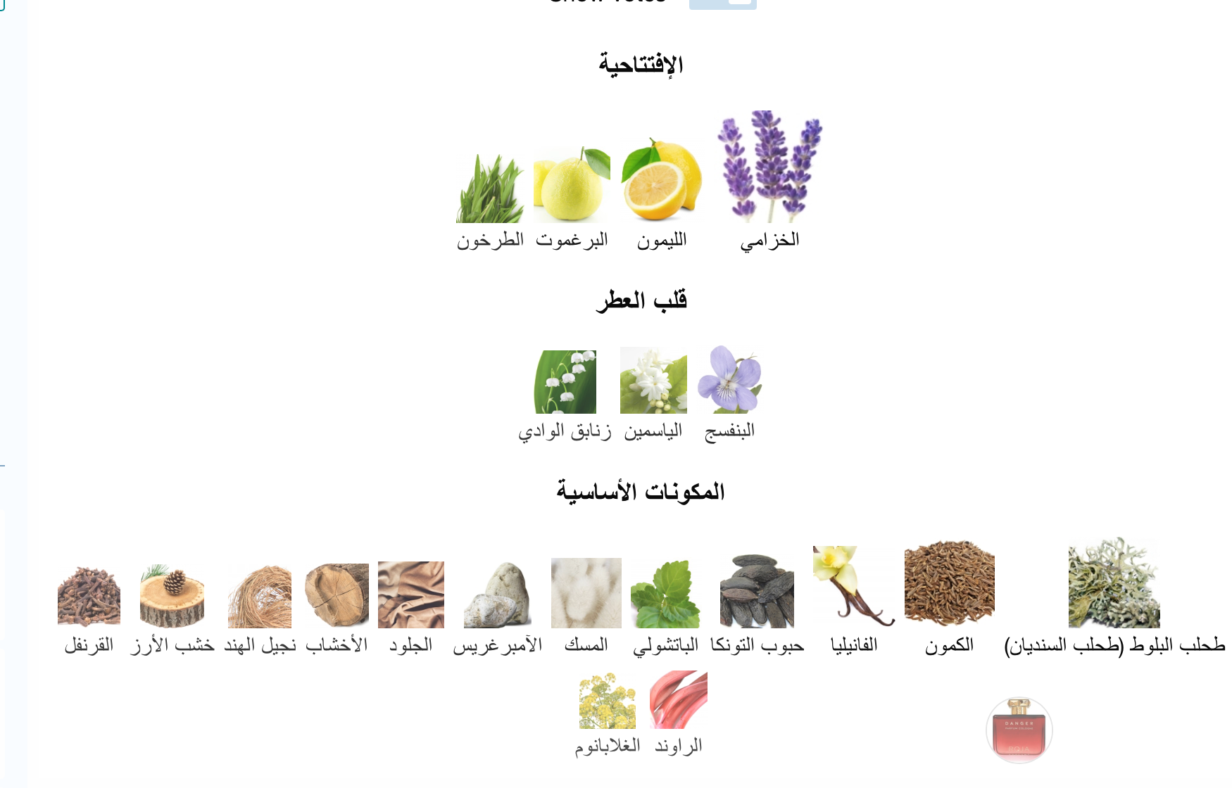 القاعدة: قاعدة فاخرة معقدة تضم طحلب السنديان، الكمون، الفانيليا، حبوب التونكا، الباتشولي، المسك، الأمبرغريس، الجلود، الأخشاب، نجيل الهند، خشب الأرز، القرنفل، الراوند والغالبانوم.
