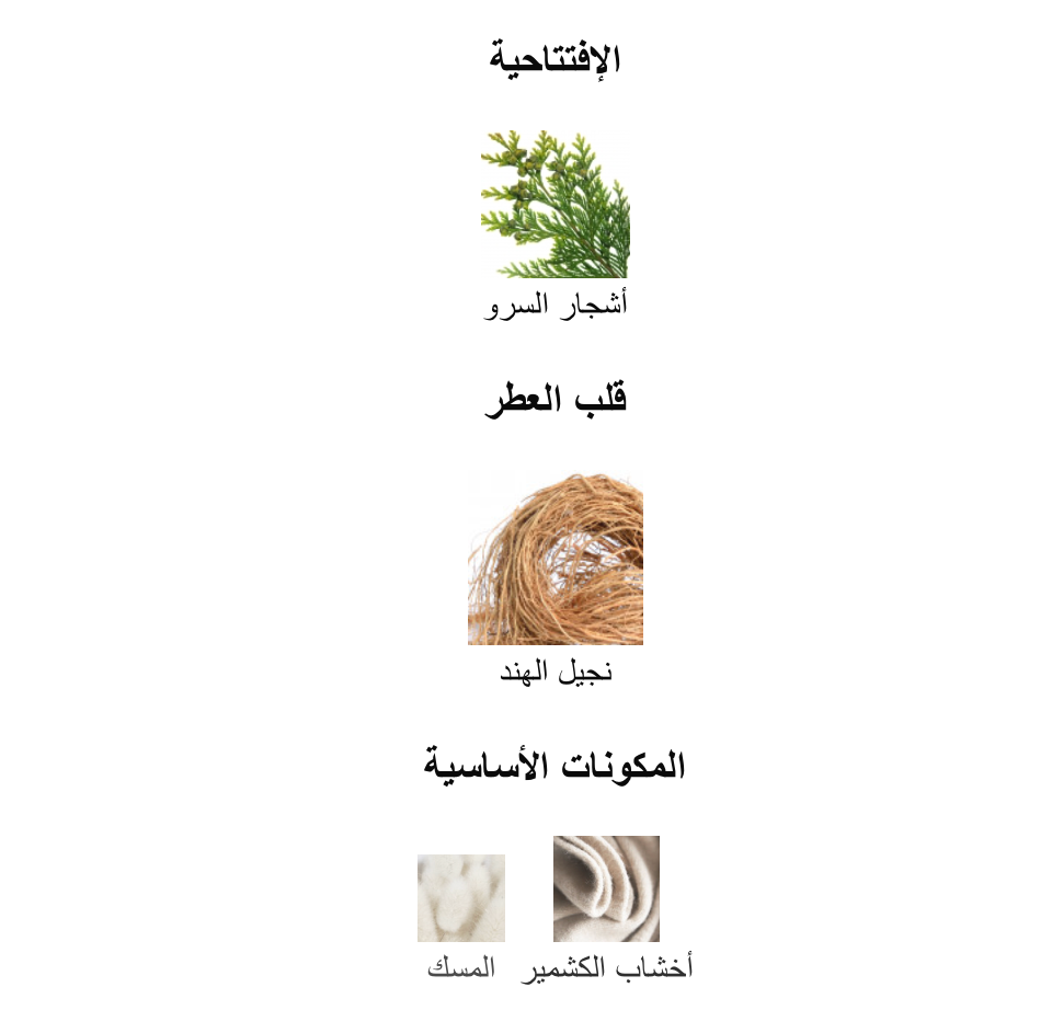 يفتتح برائحة منعشة من أشجار السرو، يتوسطه قلب عطري غني من نجيل الهند، ويستقر على قاعدة دافئة من أخشاب الكشمير والمسك، ليمنحك حضوراً رجولياً قوياً يفيض بالغموض والأناقة.